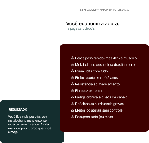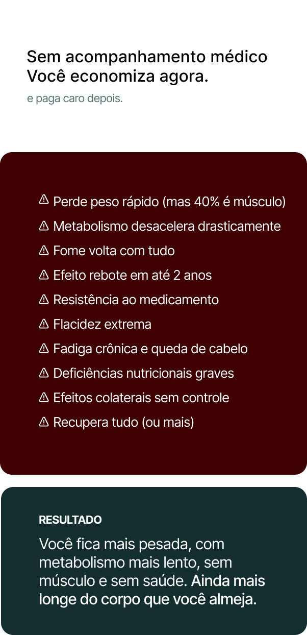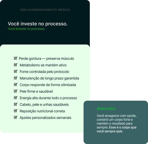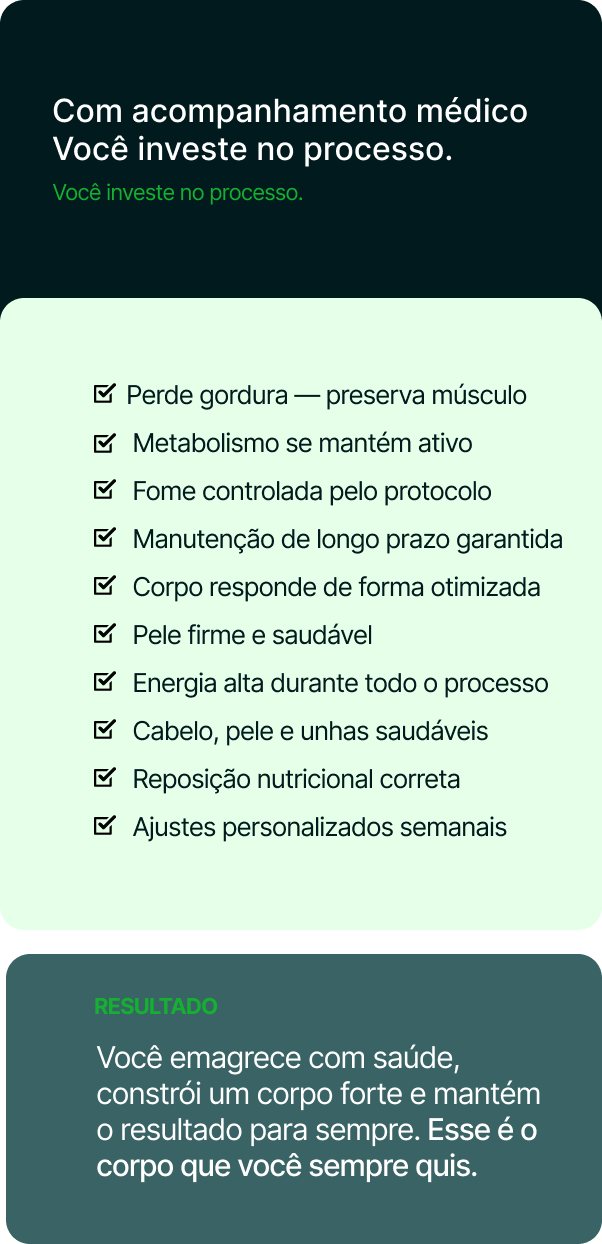 Com acompanhamento médico completo e equipe multidisciplinar, aliados a um protocolo personalizado e à tecnologia de ponta, você emagrece preservando massa muscular, energia e qualidade de vida.